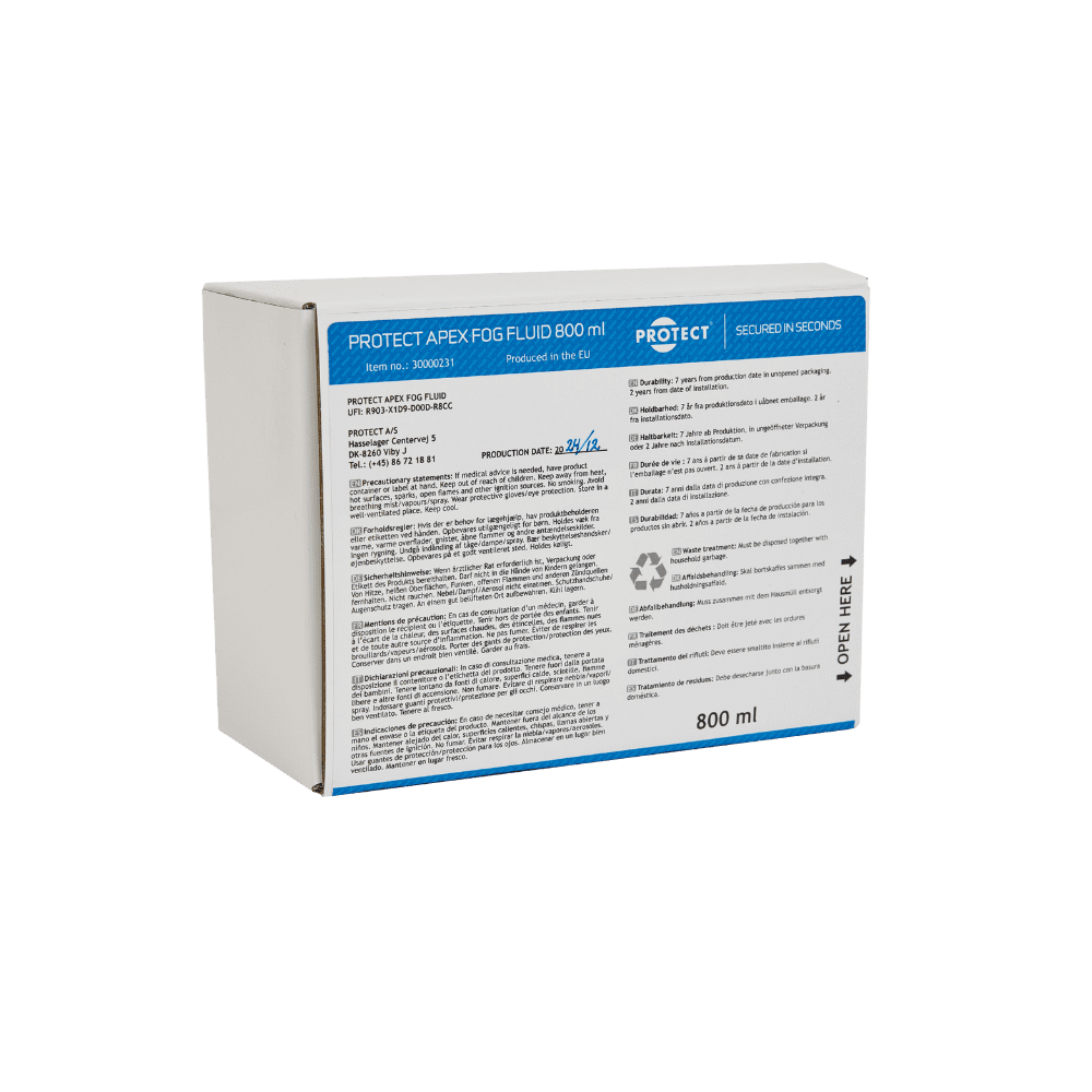 Guarda il fluido nebbiogeno PROTECT APEX in azione Il fluido nebbiogeno APEX riempie rapidamente la stanza dopo l’attivazione, rendendo impossibile vedere qualcosa!